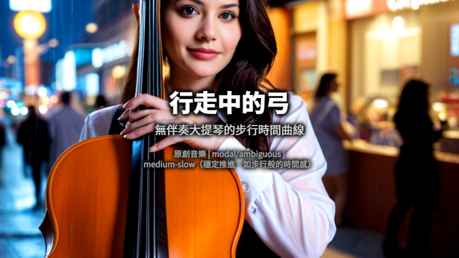 以無伴奏大提琴的單線條旋律建立如步行般穩定的時間脈動,全曲不依賴打擊與疊錄,僅透過弓法、音區與微幅變奏推進敘事,並以自然收弓完成長作結構。