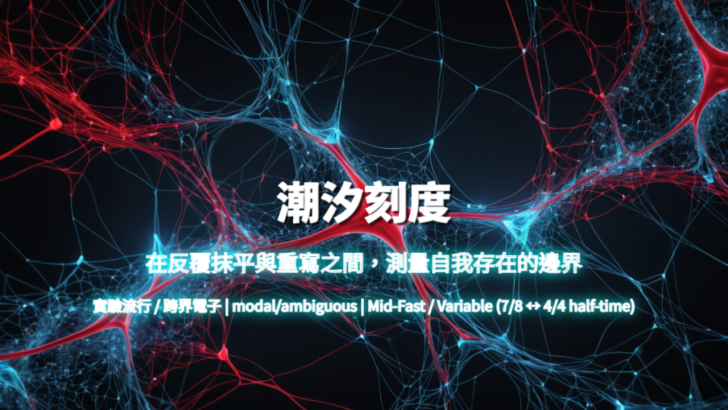 〈潮汐刻度〉以「沙灘刻線被潮水抹平」作為核心隱喻,描寫個體在時間循環中不斷留下痕跡、又被世界洗去的狀態。主歌透過不規則拍號與節制的人聲敘事,呈現內在的不安與自省;副歌回到穩定的半拍節奏,像潮水一次次覆蓋又退去,留下短暫卻清晰的空白。文本不追求宏大的宣告,而是聚焦於「仍然要寫下去」的溫柔執拗,讓循環本身成為情感的主體。