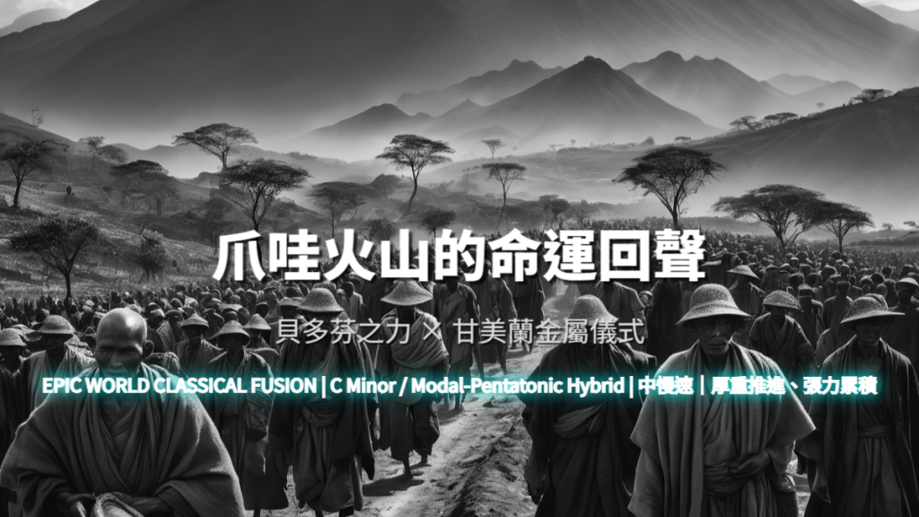 Intro(地層低鳴)→ Fate Motif Emergence(命運動機轉化)→ Volcanic Accumulation(能量堆積)→ Ritual Confrontation(人與自然對話)→ Eruption Hold(爆發後的靜止)→ Ending(正式終止)。