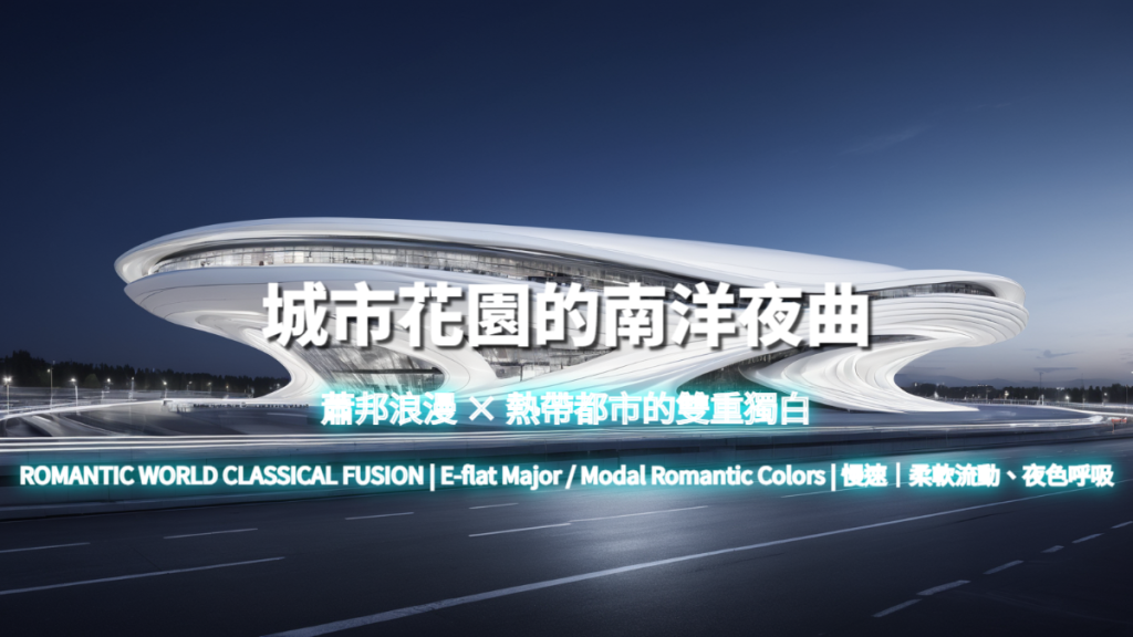 Intro(城市入夜)→ Piano Nocturne Bed(浪漫底色建立)→ Cello Narrative(南洋往事敘述)→ Erhu Memory Line(歷史回聲)→ Urban Garden Blend(自然與城市交織)→ Ending(夜色靜止,正式終止)。