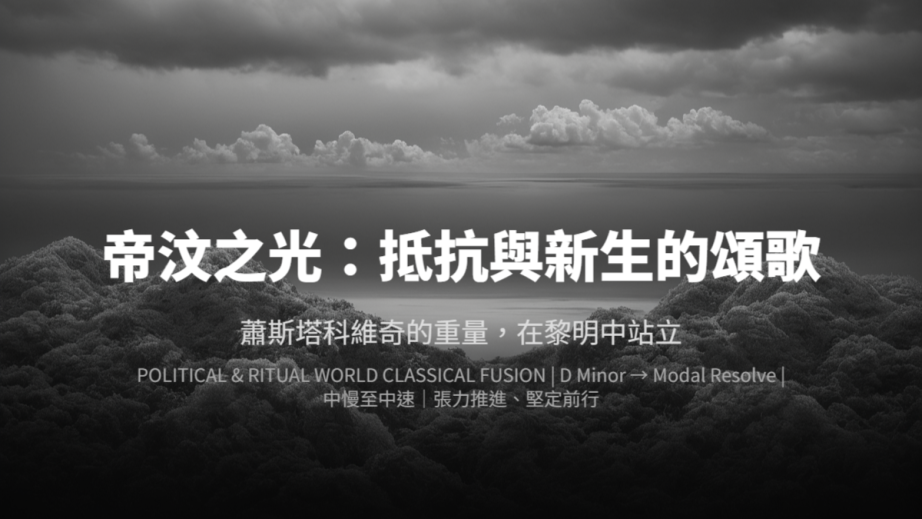 Intro(壓迫的靜止)→ Resistance Motif(抵抗動機)→ Collective Pulse(集體心跳)→ Tension Plateau(長時間承受)→ Dawn Emergence(新生曙光)→ Ending(和平站立,正式終止)。