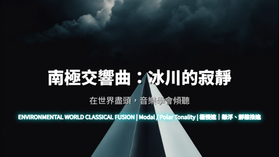 White Silence(極地靜默)→ First Human Tone(第一個人類音)→ Glacial Breathing(冰川呼吸)→ Vast Plateau(無限平台)→ Melting Awareness(覺察與不安)→ Ending(聲音撤退,正式終止)。