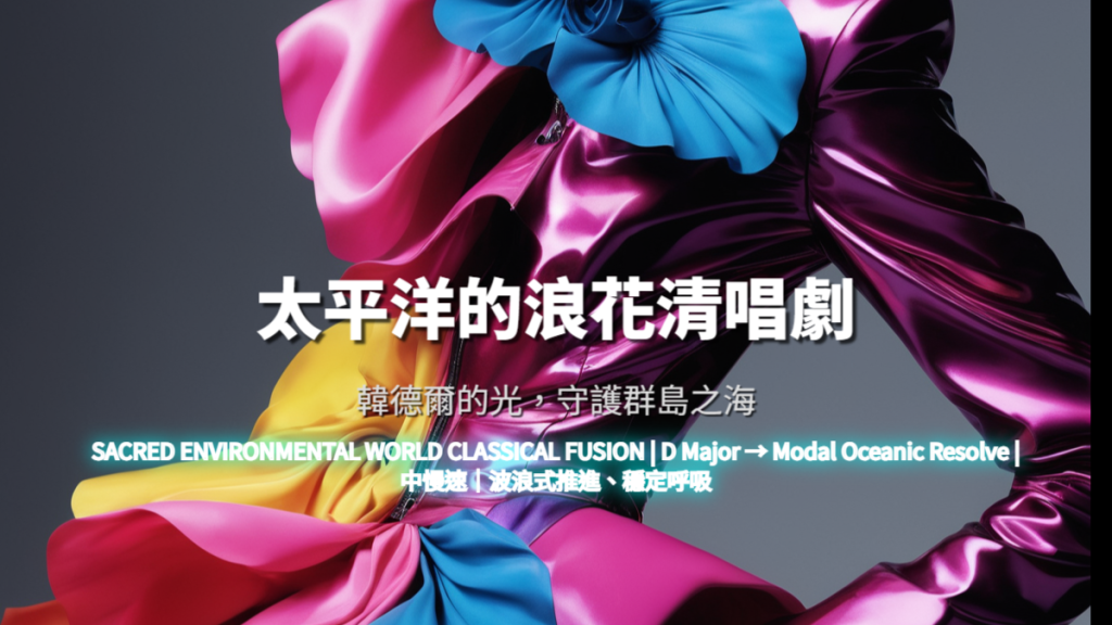 Intro(深海低吟)→ Flowing Aria(清唱式旋律展開)→ Meke Pulse(土地節奏)→ Communal Chorus(集體守護)→ Rising Tide Reflection(海平面凝視)→ Ending(光中守望,正式終止)。