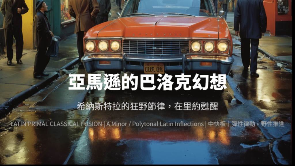 大提琴使用快速跳弓、敲擊弓與不規則重音;Pandeiro 提供森巴與 Bossa Nova 混合律動;拉丁打擊群建立多層節奏;銅管與弦樂 Ostinato 提供巴洛克張力骨架。