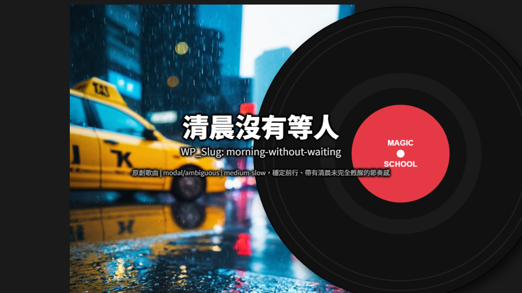 這首作品以「主歌–副歌–主歌–副歌–尾聲」的標準敘事結構,承載一段極為日常卻不可複製的情感經驗。中曲長度讓畫面得以展開:霧氣未散的城市、被時間推著前進的交通系統,以及在人群中短暫對齊又錯開的兩條人生線。歌曲型態選擇以人聲為核心,讓歌詞成為敘事主體,而貼近、幾乎耳語式的人聲處理,使聽者彷彿站在說話者身旁。結構上,主歌負責鋪陳通勤細節與內心觀察,副歌則提煉成一句可被反覆記住的核心情緒。高潮不以音量堆疊,而以情感確認作為頂點;結尾尾聲刻意收斂,像清晨列車離站後留下的空氣,完成而不煽情。