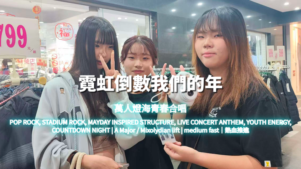 結構參照五月天式體育館段落推進邏輯:清晰主歌敘事、副歌口號化旋律、橋段倒數爆發。情緒弧線由青春記憶升溫至萬人合唱高潮,最終以全場齊喊作為正式終止。