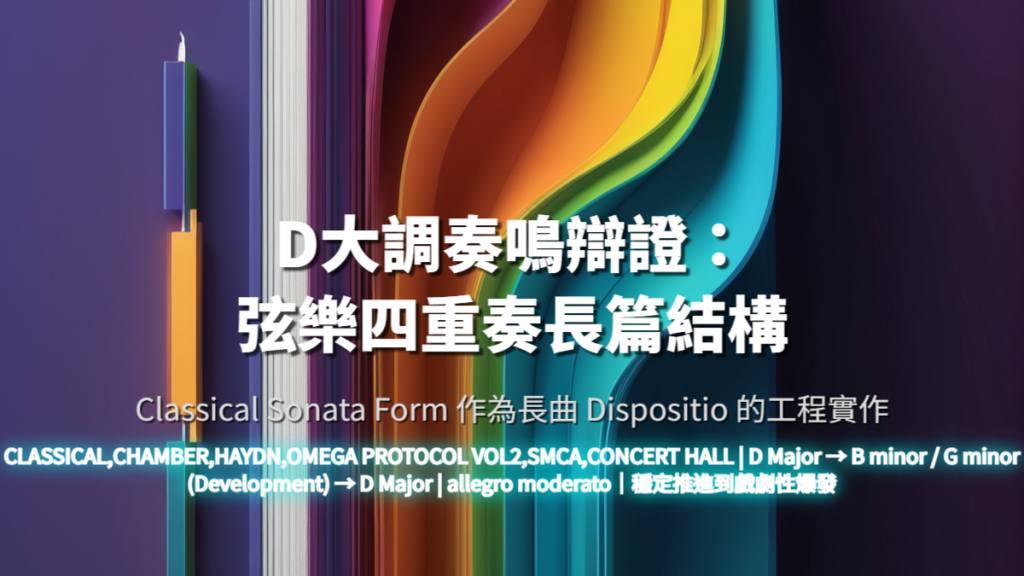 嚴格遵守 Classical Sonata Form:Exposition(主題A/主題B)、Development(調性游移與動機分解)、Recapitulation(主題回歸)、Coda(裁決)。動態設計依賴弓壓、音域與和聲密度,而非後期效果。避免現代混響過度;保持室內樂清晰度與自然空間感。