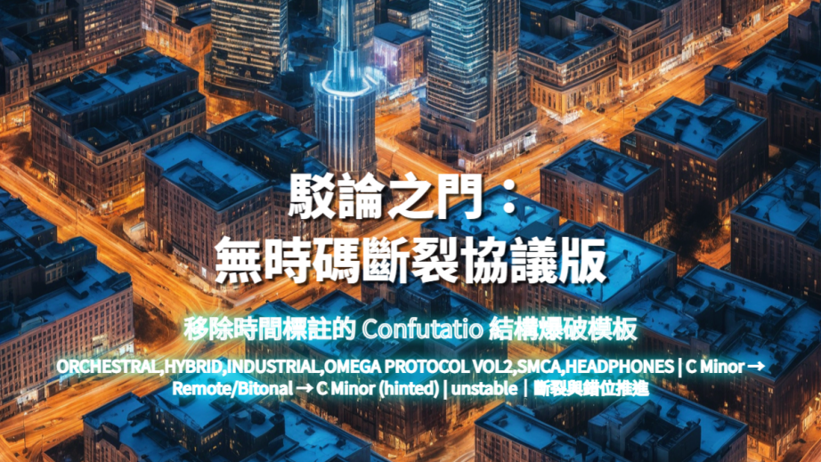 禁止平滑過渡。必須在瞬間完成動態與風格轉向。採用遠親調碎片、雙調性疊加與節奏位移製造張力峰值。混音允許短暫失真與顆粒破碎,但保留主題節奏辨識度。結尾不淡出,必須 Grand Fermata。
