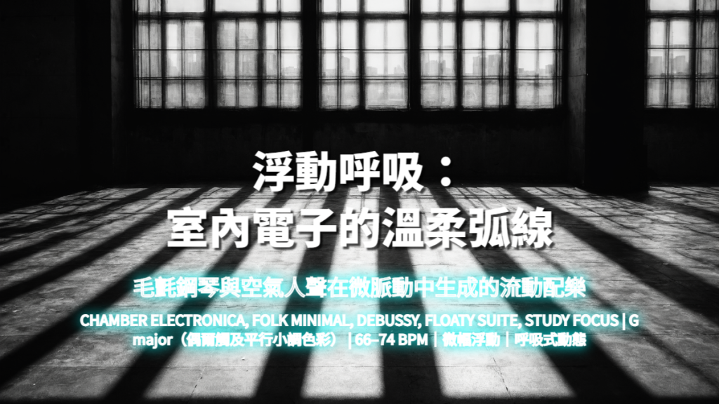 Folk × Chamber-electronica × Minimal classical。控制高頻亮度,保留空氣感與殘響尾巴。每次張力堆疊後以較薄配器回落,避免劇烈對比。節奏不僵硬,允許微幅 tempo shift。段落交界以 reverb tail 交疊銜接。