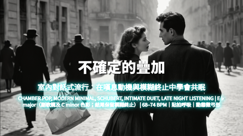 Intimate modern chamber-pop。鋼琴略微走音營造脆弱感;弦樂 muted、貼近麥克風。女聲句尾後由溫暖 sub bass 回應;男聲句尾保留氣音。副歌加入空氣墊底與三度和聲,但避免完全解決。尾聲減層,保留電子浪湧與顫動和弦。