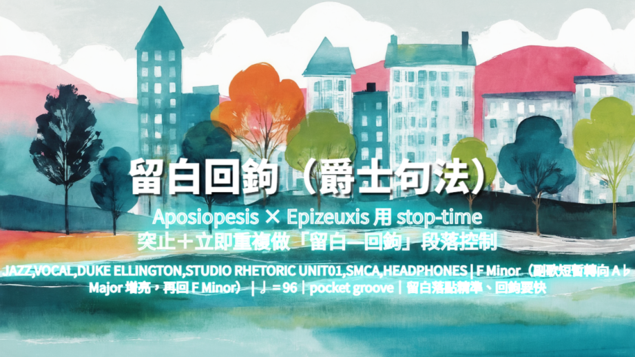 錄音室爵士聲樂,小編制四重奏+可選薩克斯短答句。主唱近距離、口語化、咬字清楚;鋼琴以和聲 hits 與空拍切出邊界;低音維持 pocket 重力中心;鼓以刷奏與精準 backbeat 做標點。每段至少一次 stop-time 突止(乾淨留白),緊接著立刻回鉤完全同句(立即重複)。動態控制式增壓:越後段留白更短、回鉤更硬、和聲更緊,收在完成式終止不淡出。