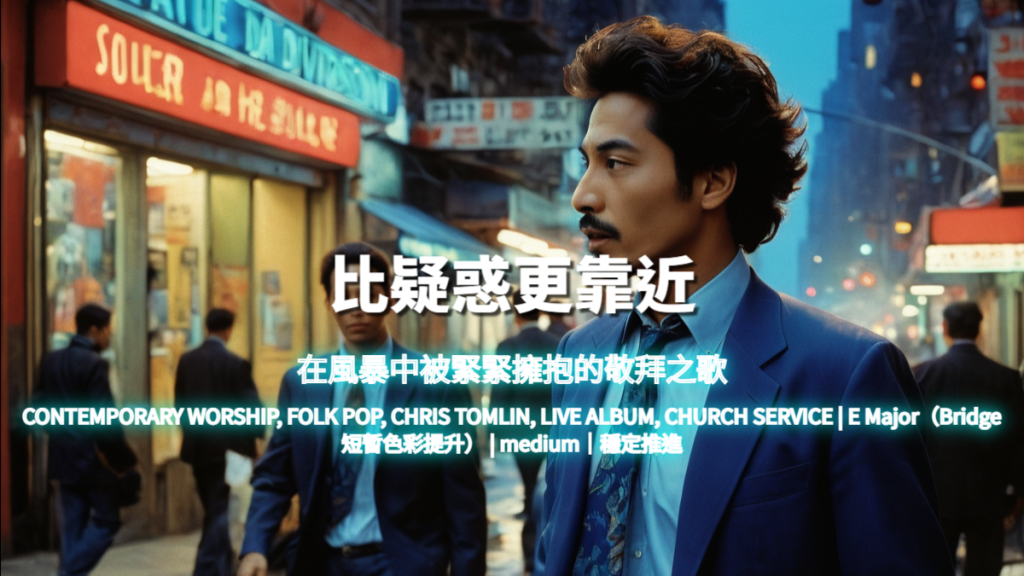 子流派定位為 Modern Worship-Pop Ballad 融合 Folk。混音以人聲為核心,前段乾淨貼耳,副歌拉開空間殘響。動態設計採漸進堆疊:Verse 保持稀疏編制,Pre-Chorus 增加 Pad 與低頻推力,Chorus 進入完整節奏組與合唱。Bridge 做色彩提升與情緒放大,再刻意抽空一次,製造最後副歌的最大對比。