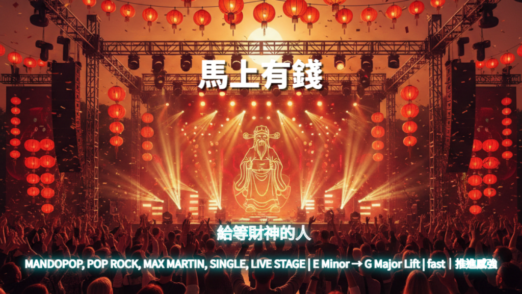 流行搖滾結合節慶銅管元素。主歌節制、節奏乾淨,副歌全面打開立體空間。低頻緊實不渾濁,鼓組前置、銅管高位穿透。第二段後加入和聲疊層與八度強化,尾段升Key或和聲轉明亮,營造「翻盤」的象徵感。