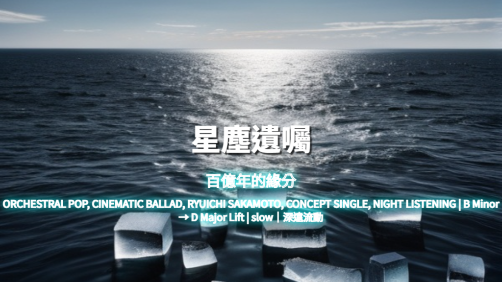 現代交響流行融合禪意氛圍。鋼琴與合成墊底構成星空背景,弦樂在Pre-Chorus層層推進。副歌加入定音鼓與厚疊和聲形成史詩感。Bridge轉調升至明亮調性象徵重生。避免過度失真,維持高保真與空間深度。
