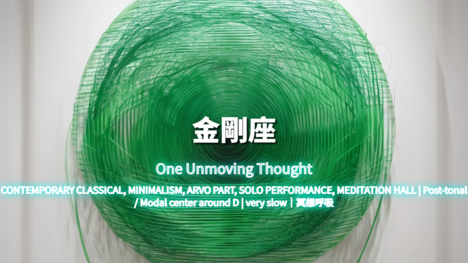 當代冥想古典。嚴禁節奏鼓點與任何流行元素。使用長弓、低頻共鳴與自然殘響。動態範圍寬廣但整體克制。空間感如寺院殿堂,殘響深而不混濁。