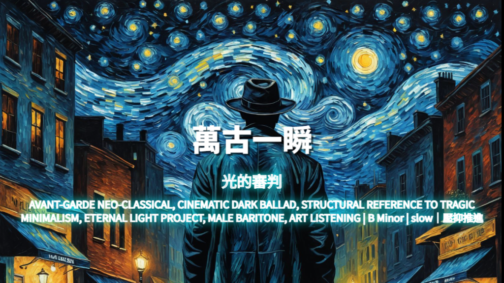 Avant-garde Neo-Classical。60 BPM慢速推進,低頻工業節拍如心跳。塤營造空洞風聲,大提琴中低音域為情緒主軸。鋼琴深混響處理。人聲前置、乾燥且帶裂痕質感。