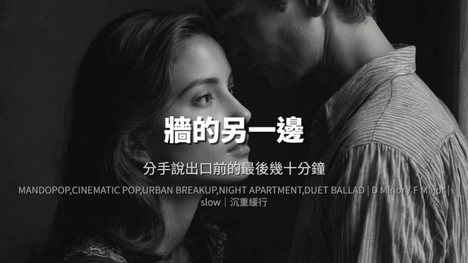 音樂風格定位為 dark cinematic mandopop ballad。混音策略強調乾聲人聲與近距離呼吸細節,避免甜美或溫暖音色。鋼琴使用冷調和弦與大量留白,弦樂僅在副歌提供情緒重量。整體聲場像深夜公寓的空房間:牆很薄、燈很冷、遠處城市聲音若隱若現。動態曲線保持克制,讓副歌呈現沉重的接受感而不是戲劇性爆發。