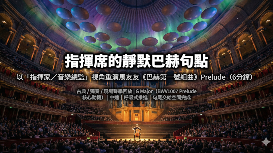 這個版本刻意改用「指揮家/音樂總監」視角,因為在威格摩音樂廳(Wigmore Hall),真正需要被指揮的,往往不是樂團,而是:靜默、空間、觀眾的呼吸、以及回聲的落點。延續我們在上海音樂廳的巴赫《第一號無伴奏大提琴組曲》Prelude,樂譜不變、演奏者仍是馬友友,但威格摩的聲學讓每一個音符的命運改變:研究描述它的典型聲音是「響亮、寬闊、回響卻清晰」,滿座時中頻殘響約1.5秒,座席為全包覆軟椅,並有地毯等吸收元素,卻仍保有充足的回響與透明度——這種矛盾正是它的魔法。作為指揮/總監,我的工作是把這種透明度轉化為敘事:讓弓毛顆粒與換把聲成為「標點」,讓早期反射成為「第二次發聲」,讓句尾的提前放開把殘響交給空間,最後用一個不可妥協的「正式終止」收束全曲。虛擬導師設定為坂本龍一式的結構觀:把留白視為音符,把控制視為情感,把六分鐘雕刻成「一段完整的語法」。