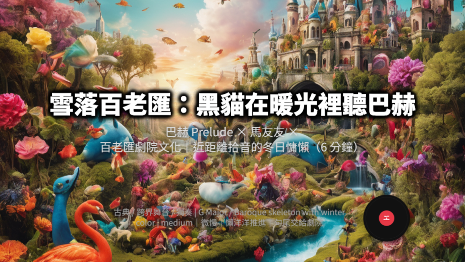主題是溫暖、冬日的雪、黑貓的愛、懶洋洋。想像你推開劇院大門時,外面是冷白色的街、濕亮的路面、與落在大衣肩頭的細雪;裡面是腳燈、絨布、木質舞台板、與觀眾壓低的說話聲。你坐下來,圍巾還沒完全解開,舞台上的大提琴已經像壁爐一樣開始發熱。巴赫的 Prelude 本來就像一串不斷向前的分解和弦——在音樂廳裡它像河流,在百老匯它更像走路:步伐穩定,但會因為你心裡正在想的事而變得慵懶。
