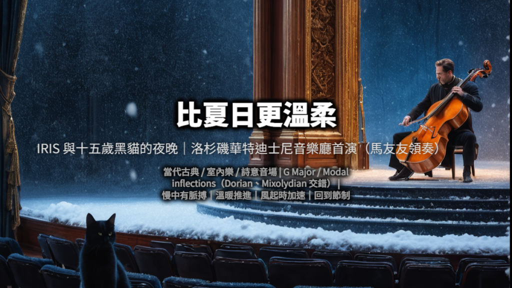 今晚在迪士尼音樂廳,馬友友把莎士比亞寫成聲音:IRIS 抱著 15 歲黑貓,一起被木質回聲溫柔擁住。🎻🌿❄️🐈⬛