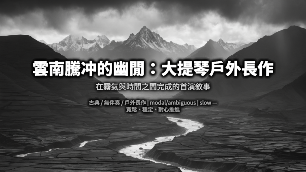 本作以雲南騰冲的慢時間感為核心:霧氣、遠山與不急於回應的空氣。完全無伴奏的設定,使大提琴成為唯一的敘事者,負責旋律、結構與時間推進。長構策略避免任何早收或情緒捷徑,改以動機的耐心反覆、音程關係的微幅轉位,逐步建立內在秩序。所謂的高潮並非外放,而是長時間維持穩定方向的能力;結尾以完成式終止,像旅程在抵達後自然停步。