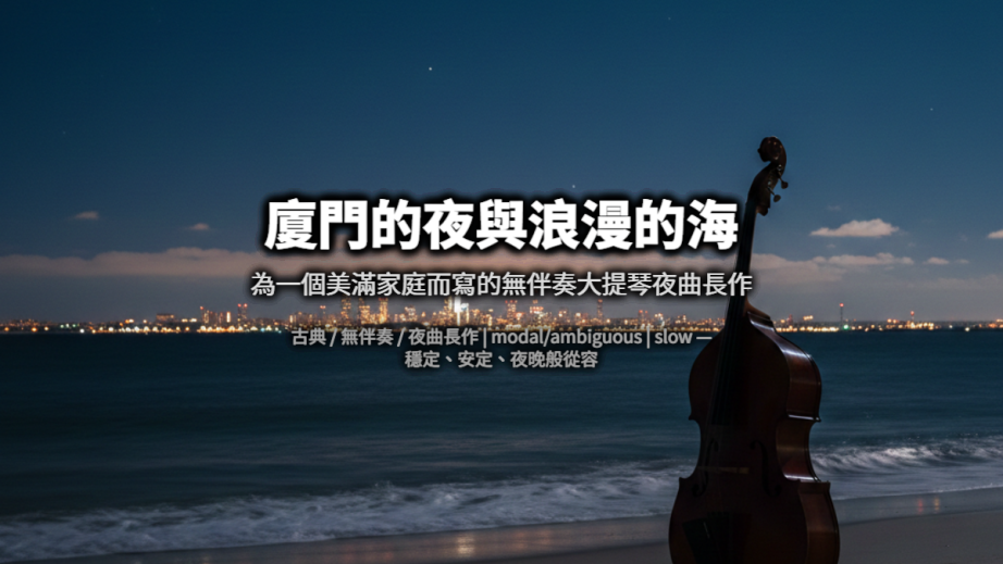 全曲規劃為多個夜間感明確的延展段落(40–60 小節級),以音域、弓速與旋律密度的變化來描繪夜海層次。演奏與錄製不加入任何人工殘響或聲音層,讓音樂直接面對空間。可驗證目標包括:聽眾能感受到「坐在第一排」的親近距離、能在長時間結構中保持安定而不疲乏,並在結尾清楚感知祝福的完成。