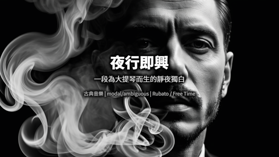這首作品以「夜」作為隱喻核心,沒有明確節拍的引子如同意識甦醒前的低語,由大提琴在自由速度中探索音色與呼吸。主題旋律緩慢浮現,帶有歌唱性,像是夜行者心中的一條思緒。隨後的變奏並非炫技,而是透過延遲解決與滑音暗示內在情緒的波動。中段的反思段落以停頓與空白構成自我對話,最終回歸簡化的主題,讓旋律逐漸放下重量,在尾聲以自然殘響結束,留下安靜卻完整的夜之餘韻。