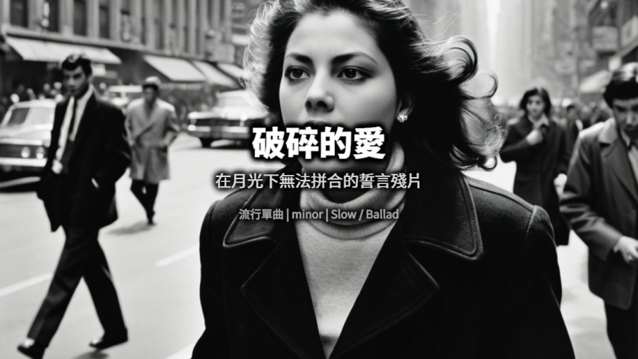 《破碎的愛》描寫一段無法挽回的感情殘局,從鏡中自問、月下等待到最終的心碎確認,情緒層層堆疊,呈現出失去之後的空洞與無力,是一首極具共鳴感的抒情流行歌曲。
